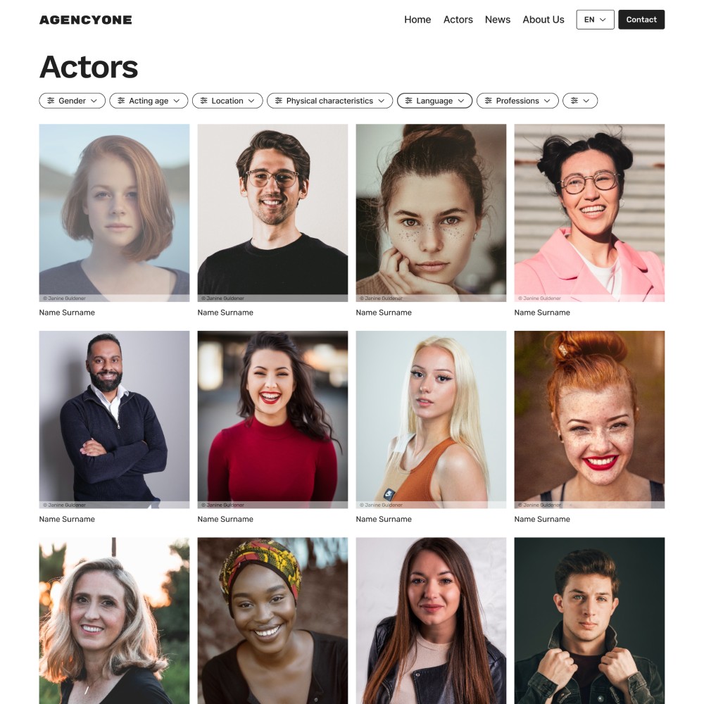 When you log in to Filmmakers through our service, we automatically create a fully-formed website using your existing Filmmakers data. Your agency details—logo, contact information, and branding—sync instantly, along with complete client profiles including photos, skills, credits, showreels, and awards.